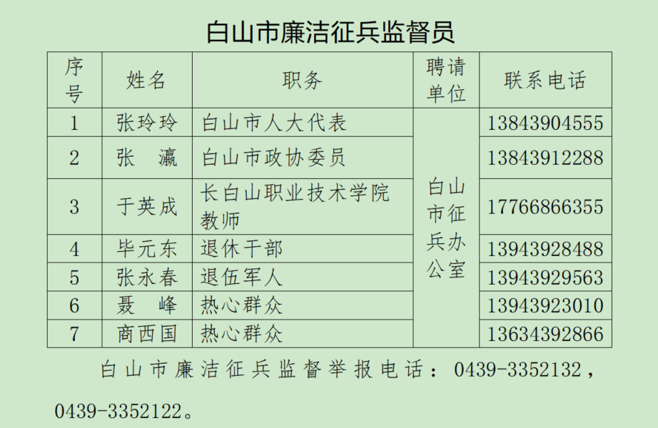 为维护广大应征青年的合法权益,进一步增强征兵工作的透明度,确保征兵工作公平、公正、公开,接受广大市民监督,现将白山市廉洁征兵监督员姓名、联系电话等信息公示如下:
