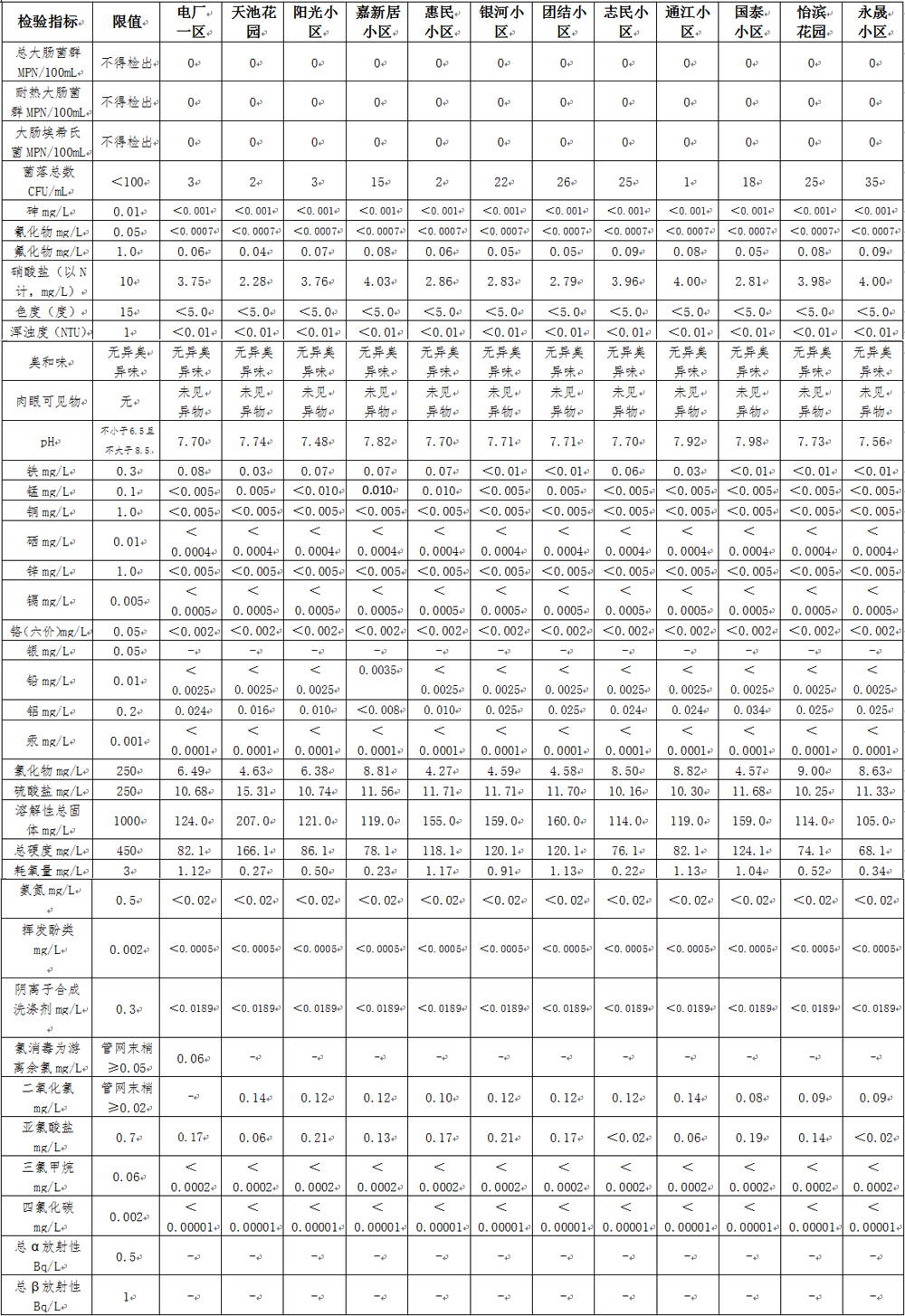 为了保障市区居民饮水安全,根据国家、省、市关于建立水质检测信息发布制度的规定,白山市疾病预防控制中心每季度对浑江区12个城市水质监测点(自建水源末梢水1个、市政管网末梢水11个)的38项主要监测指标开展检测(原星泰新苑由于停水,地点改为嘉新居小区)。经检验,浑江区2017年第三季度各水质监测点符合国家《生活饮用水标准检验方法(GB/T5750.12-2006)》,现公示如下: