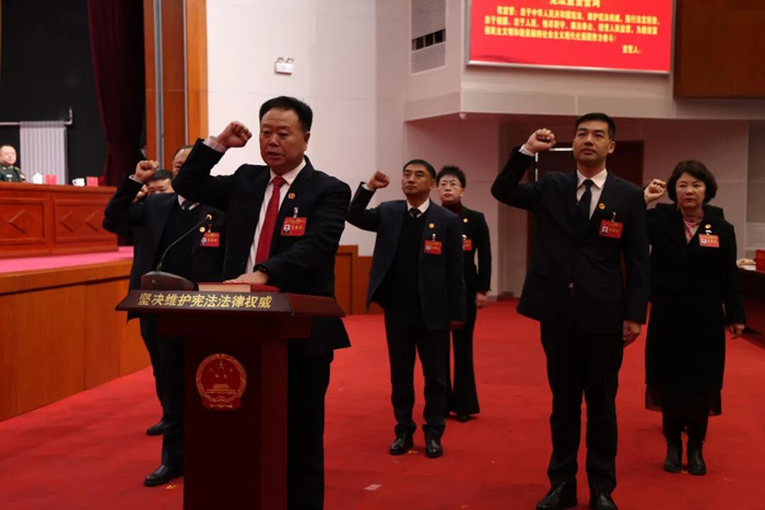 当选的市九届人大常委会主任、副主任、秘书长、委员和市监察委员会主任进行宪法宣誓。