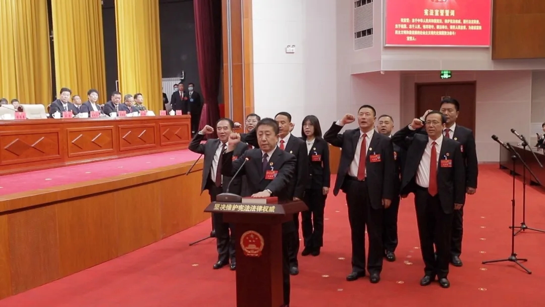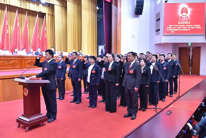 在代表们热烈的掌声中,当选的市人大常委会主任、副主任、秘书长,市长、副市长,市监察委员会主任,市中级人民法院院长、市人民检察院检察长分别与代表们见面。新当选人员进行了宪法宣誓。