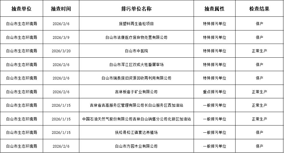 | 白山市生态环境局2026年1季度随机抽查情况公示 |
