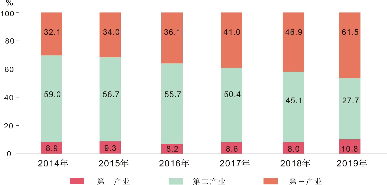 初步核算,全年实现地区生产总值比上年增长3.8%。其中,第一产业增长3.0%;第二产业增长18.3%;第三产业下降1.7%。三次产业结构为10.8:27.7:61.5%。