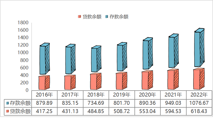 图6 2016-2022年金融机构本外币存款贷款余额(亿元)