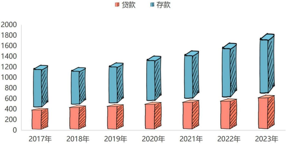 图5 2017—2023年金融机构本外币存款贷款余额(亿元)