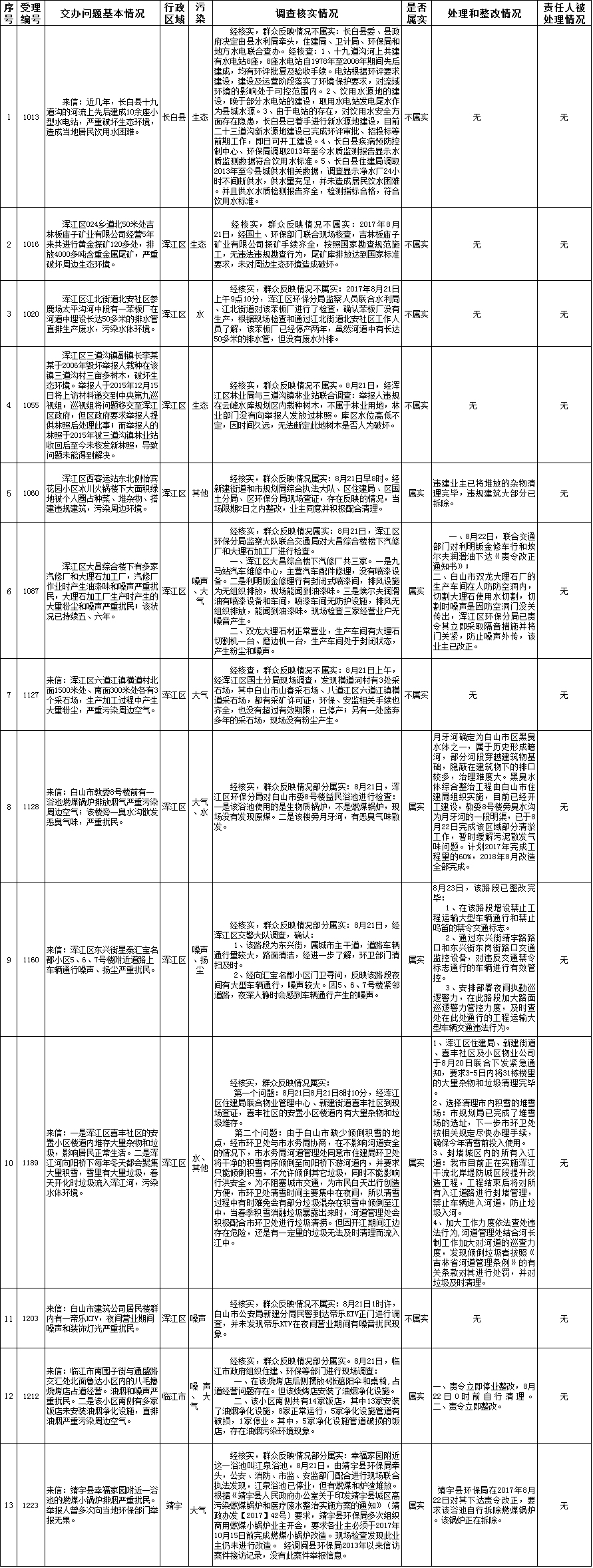白山市群众信访举报转办和边督边改公开情况一览表(第10批 2017年8月30日)
