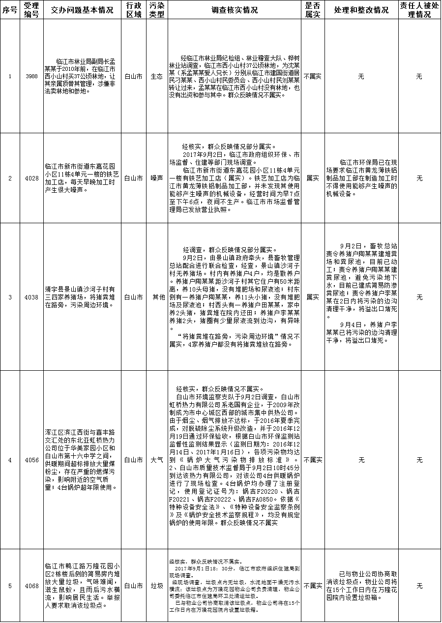 白山市群众信访举报转办和边督边改公开情况一览表(第20批 2017年9月9日)