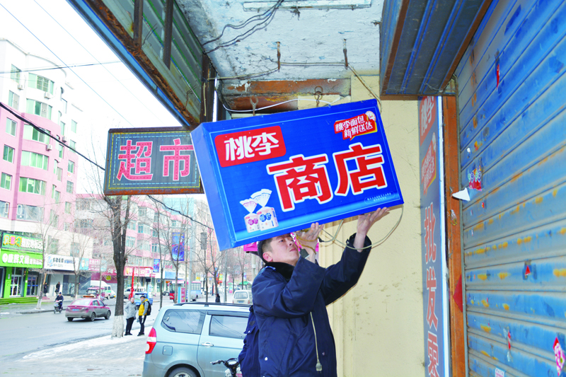 (图为:执法人员依法拆除横向牌匾 张庆飞 摄)