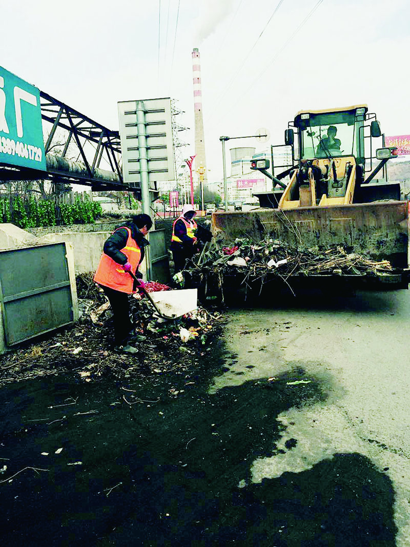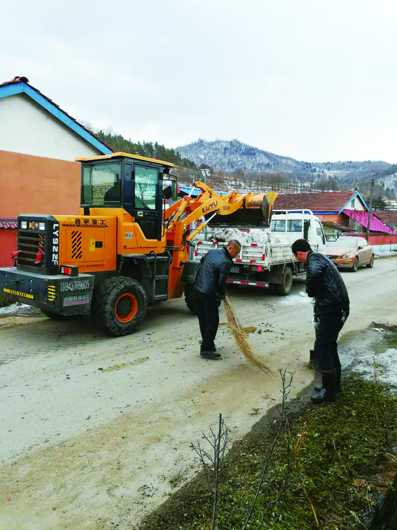 (图为:三道沟镇集中清理镇中心地段生活垃圾及积雪。)