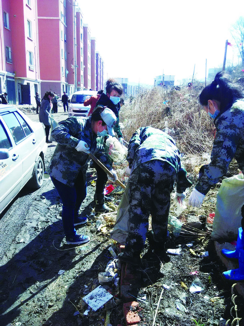 (图为:板石街道志愿者捡拾居民区周边垃圾。