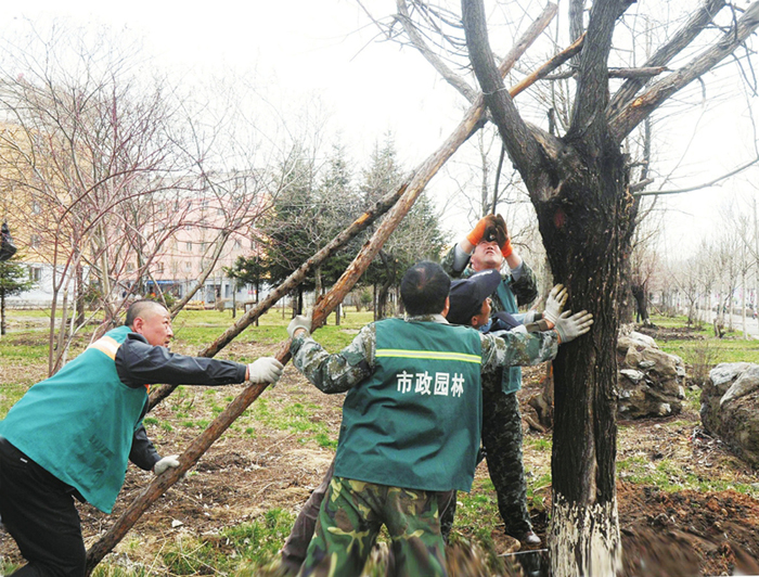 (图一:早春时节,园林工作人员就开始在绿化区内扶正树木并固定牢靠,保证成活,消除安全隐患)