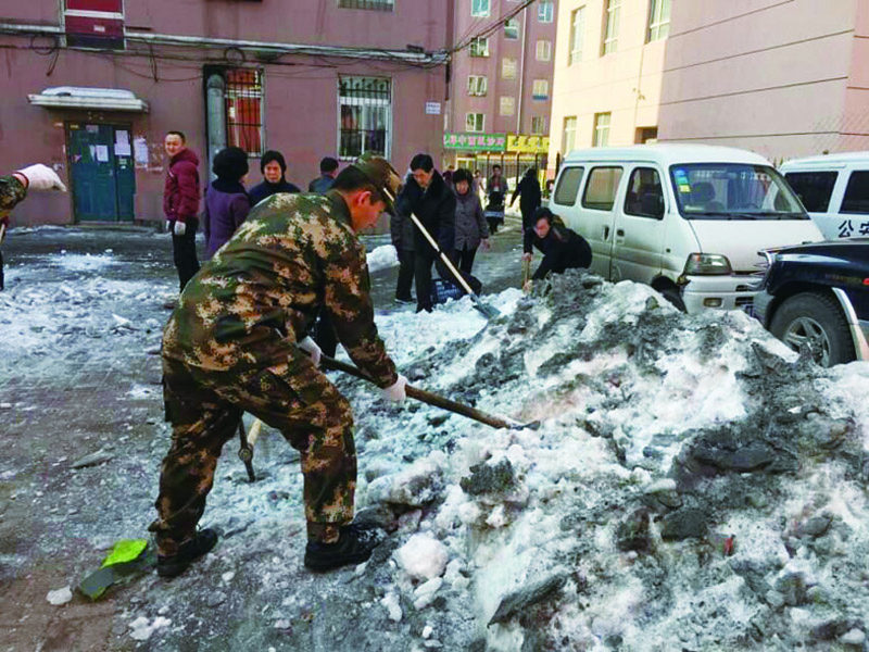 志愿者清扫越冬积雪