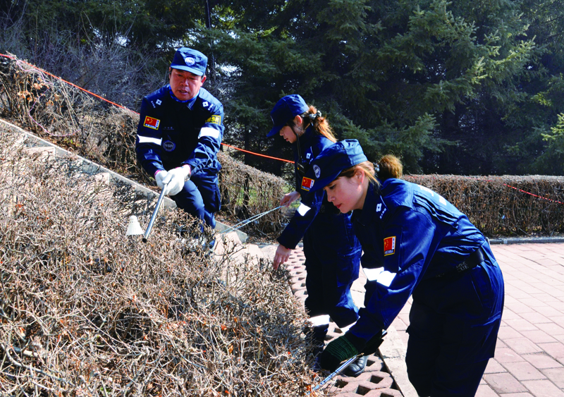 团市委志愿者服务队在北山公园清理景观植物内的垃圾