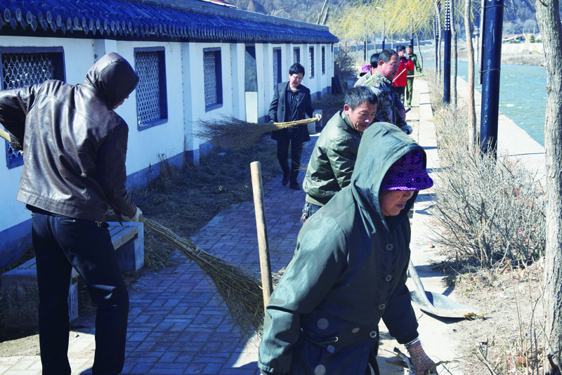 长白县帮客清理路旁杂草、土堆