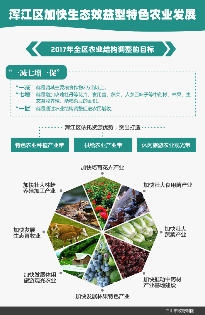 “一减七增一促”。“一减”就是调减主要粮食作物2万亩以上。突出打造“一镇一业”、“多镇一业”。“七增”就是增加玫瑰牡丹等花卉、食用菌、蔬菜、人参五味子等中药材、林果、生态畜牧养殖、杂粮杂豆的面积。“一促”就是通过农业结构调整促进农民增收。